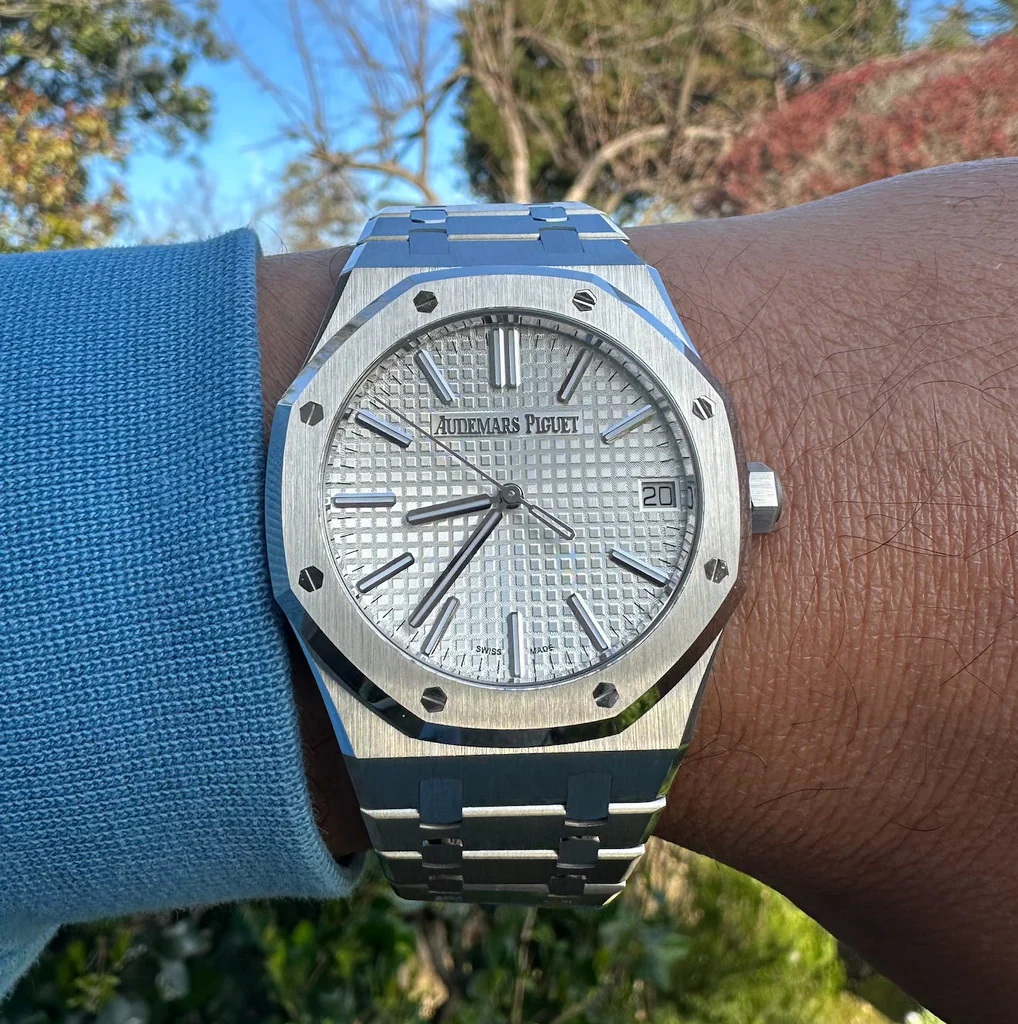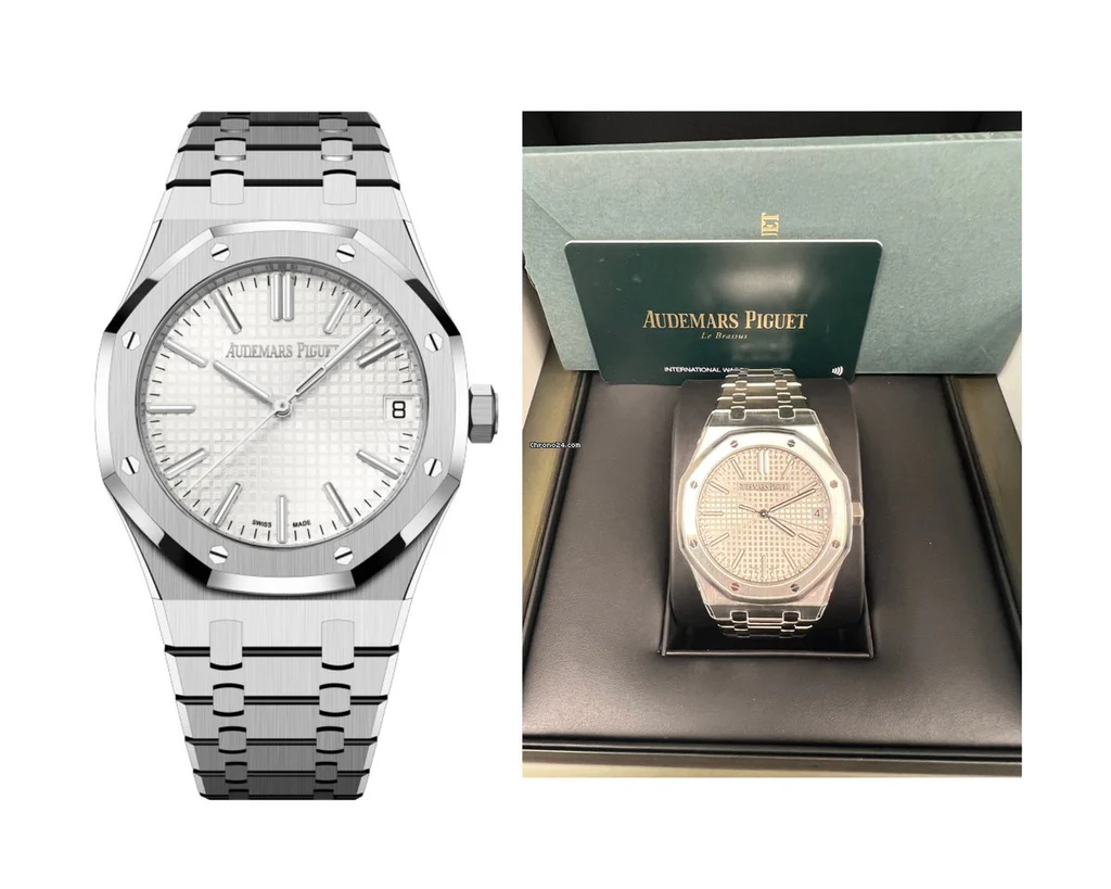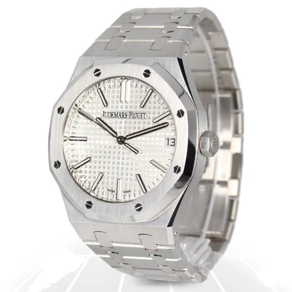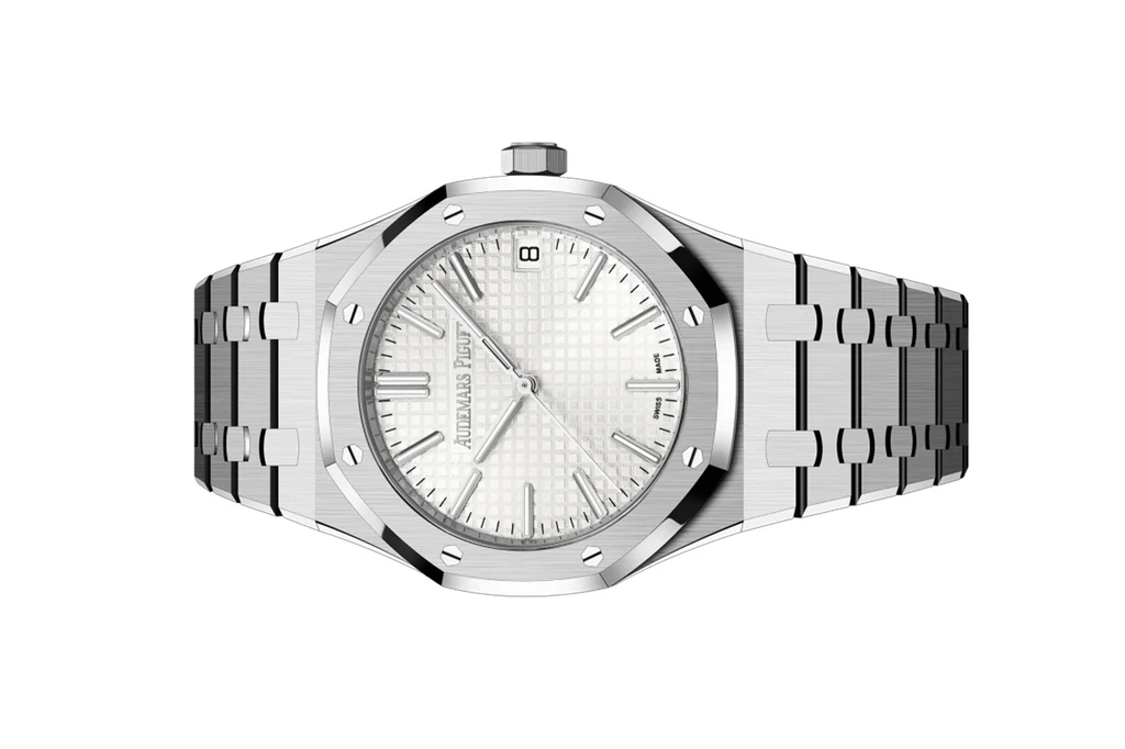 The silver dial features a “Grande Tapisserie” pattern, white gold applied hour markers and Royal Oak hands with luminescent coating.