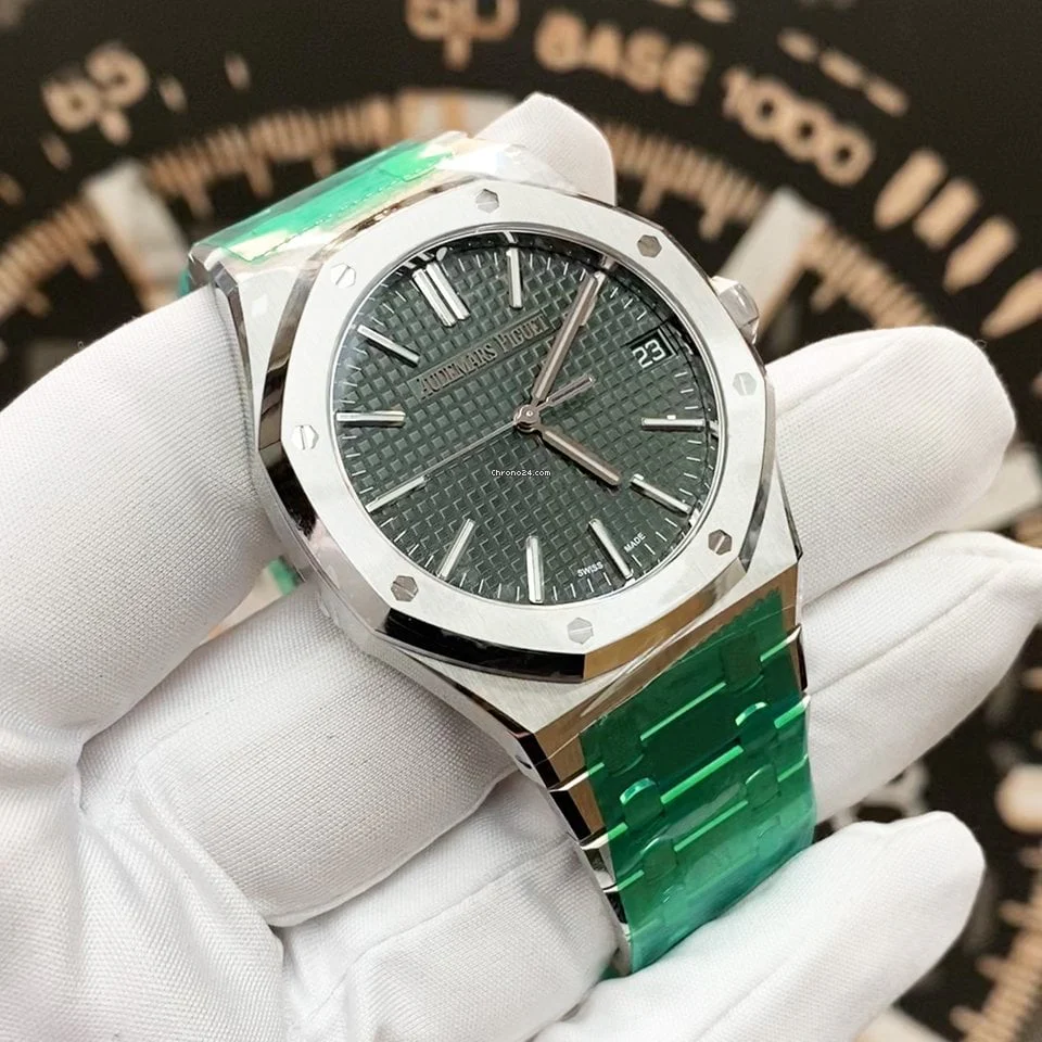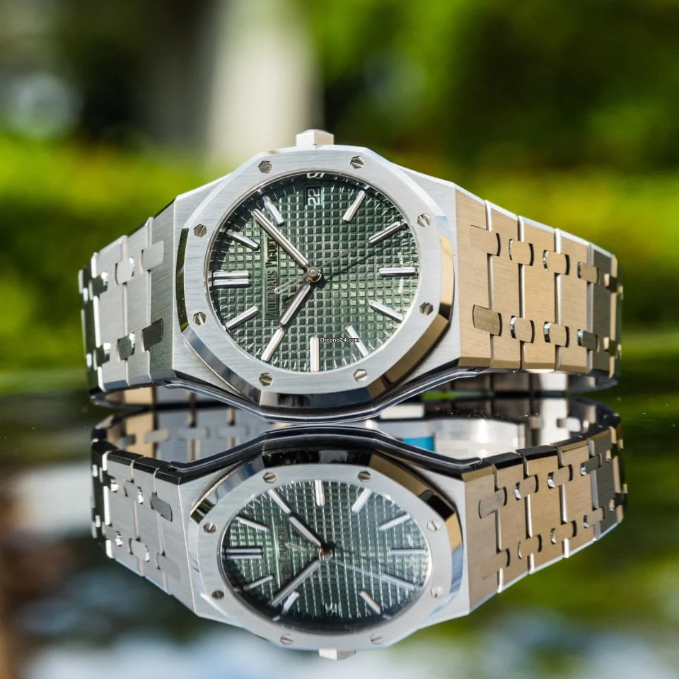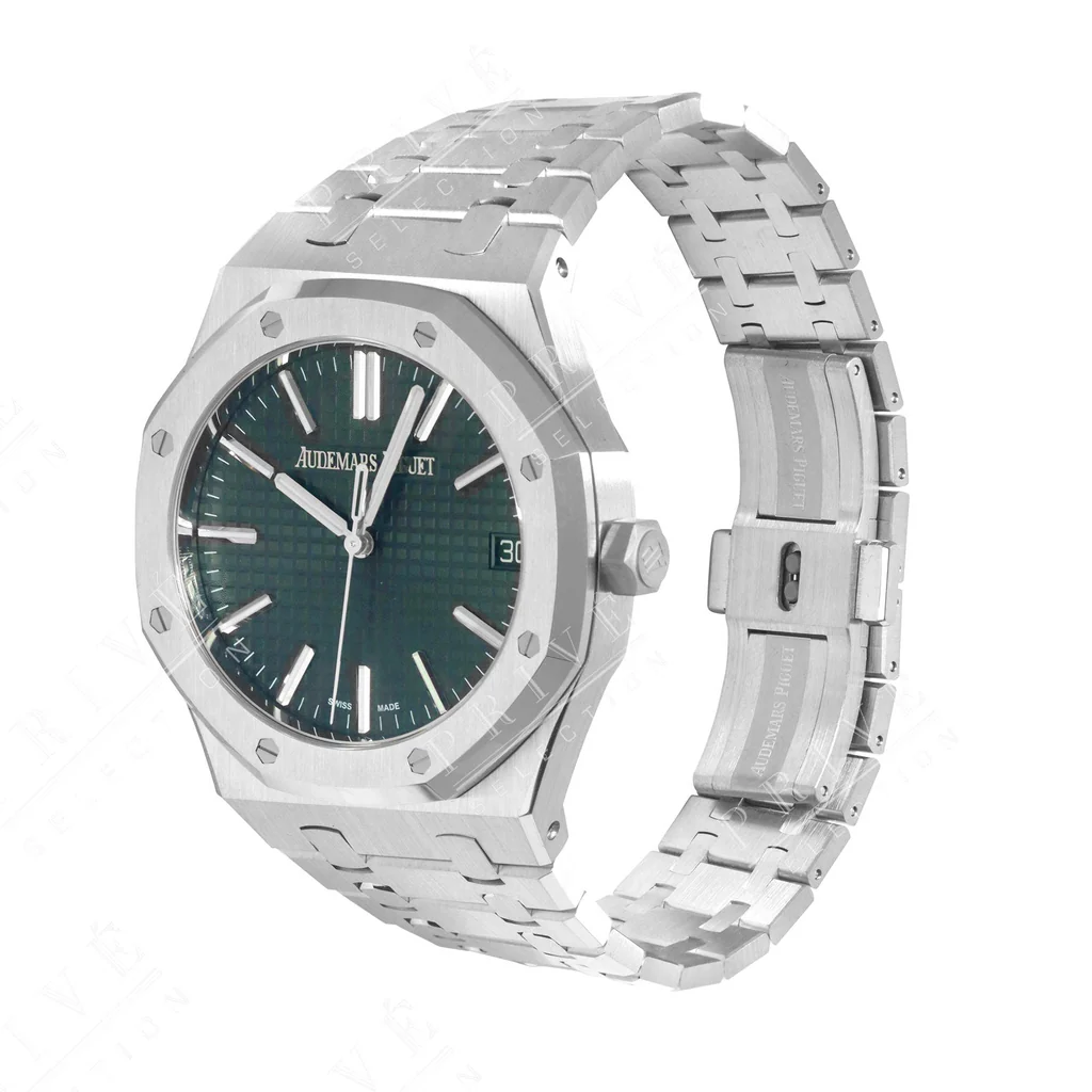 Audemars Piguet Royal Oak Automatic “50th Anniversary” 15510ST.OO.1320ST.04. 41 mm, khaki green dial with “Grande Tapisserie” pattern, white gold applied hour markers and Royal Oak hands with luminescent coating, stainless steel case, anti-glare sapphire crystal and case back, screw-down crown, calibre 4302, automatic movement, 70-hour power reserve, 32 jewels, stainless steel bracelet with AP folding clasp. Water-resistant to 50 m.