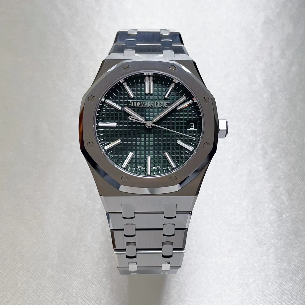 This 41 mm stainless steel Royal Oak Automatic reflects the evolution of the collection's ergonomic design and a new khaki "Grande Tapisserie" dial. Stainless steel case, anti-glare sapphire crystal and case back, screw-down crown. Khaki green dial with "Grande Tapisserie" pattern, white gold applied hour markers and Royal Oak hands with luminescent coating.