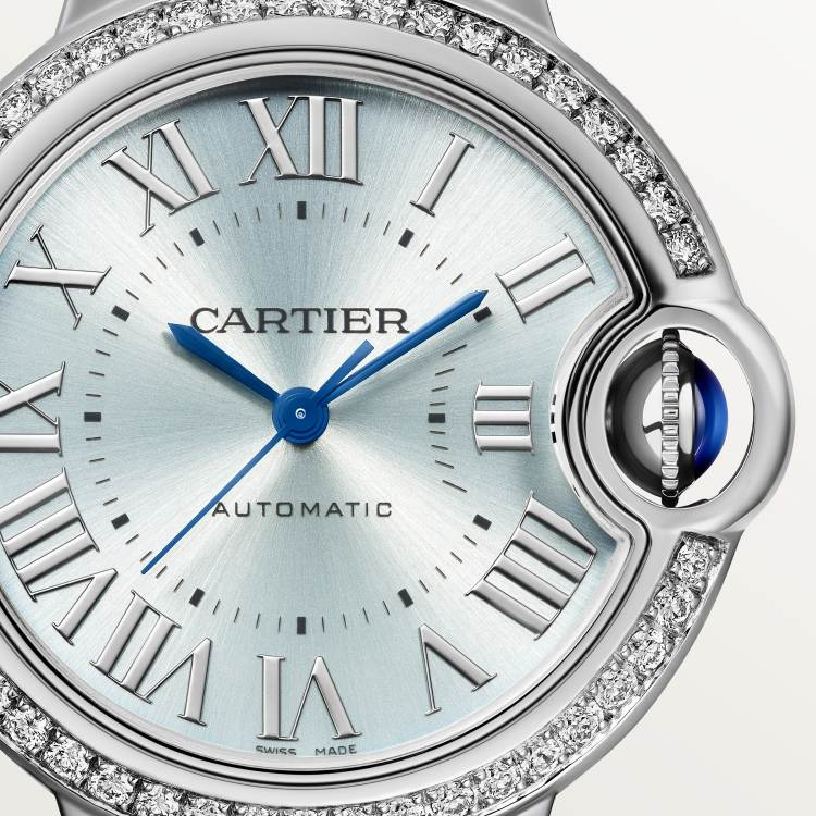 Ballon Bleu de Cartier watch, 33 mm, automatic mechanical movement. Stainless steel case, fluted crown, set with a synthetic cabochon spinel, stainless steel bezel set with 50 brilliant-cut diamonds totaling 0.58 carats, blue silvered sunray-patterned frosted dial, sword-shaped blue steel hands, synthetic sapphire crystal, interchangeable stainless steel bracelet. Thickness: 10.16 mm. Water-resistant to 3 bar (approximately 30 metres/100 feet).