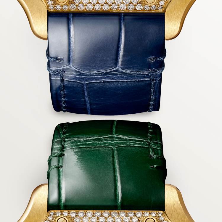 Santos watch, medium model, Cartier 1847 MC workshop refined automatic winding mechanical movement. 750‰ gold case, bezel set with brilliant-cut round diamonds. 750‰ gold heptagonal crown, set with a multi-faceted sapphire, sunray-effect dial, sword-shaped blue steel hands, sapphire crystal mirror. Both crocodile leather straps are equipped with a "QuickSwitch" strap quick-change device, which can replace the 750‰ gold folding buckle. Case width: 35.1 mm, thickness: 8.83 mm. Water-resistant to 10 bar (about 100 meters).