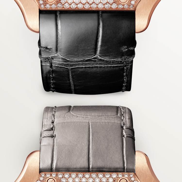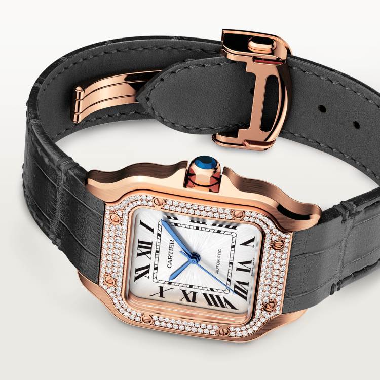Santos watch, medium model, Cartier 1847 MC workshop refined automatic winding mechanical movement. 750‰ rose gold case, bezel set with brilliant-cut round diamonds. 750‰ rose gold heptagonal crown, set with a multi-faceted sapphire, sunray-effect dial, sword-shaped blue steel hands, sapphire crystal mirror. Both crocodile leather straps are equipped with a "QuickSwitch" strap quick-change device, which can replace the 750‰ rose gold folding buckle. Case width: 35.1 mm, thickness: 8.83 mm. Water-resistant to 10 bar (about 100 meters).