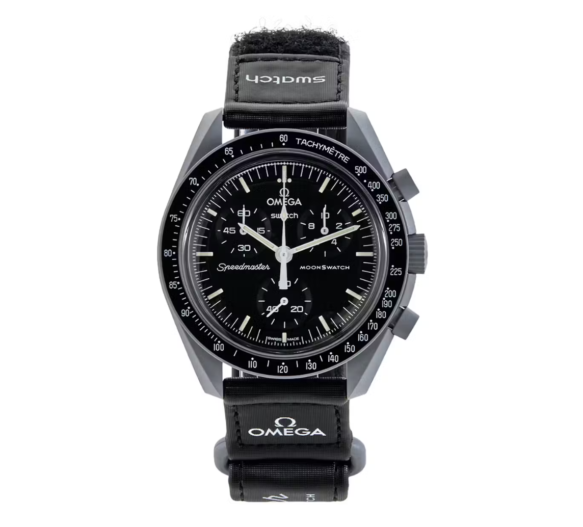 The Swatch x Omega Bioceramic Moonswatch Mission to the Moon (S033M100) is one of 11 silhouettes released by the collaboration between Swatch and Omega, offering a unique take on the Omega Speedmaster. The Swatch x Omega Mission to the Moon (S033M100) features both the Omega and Swatch logos on the "Moonswatch," with a velcro strap. The watch features all white hands and tachymeter scale like the original, quartz movement, and the premium finishes from the iconic Moonwatch. The Swatch x Omega Mission to the Moon (S033M100) also features superluminova throughout, so you'll be able to read the watch even in the dark.