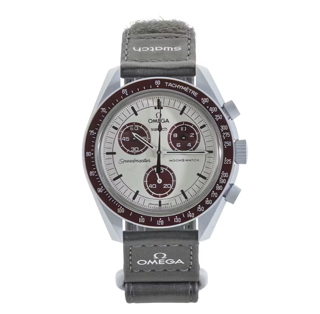 The Swatch X Omega Bioceramic Moonswatch Mission to Pluto (SO33M101) pays homage to the dwarf planet at the outer reaches of our Solar System. The Swatch x Omega Mission to Pluto (SO33M101) features Pluto's white and gray tones contrasted with the beautiful burgundy hues that are seen on the planet's surface. The watch features quartz movement, a gray velcro strap, is 3 bar water resistant, and features the Swatch and Omega logo on the dials. The Swatch x Omega Mission to Pluto (SO33M101) also features superluminova touches throughout, so you can tell time even in the dark.