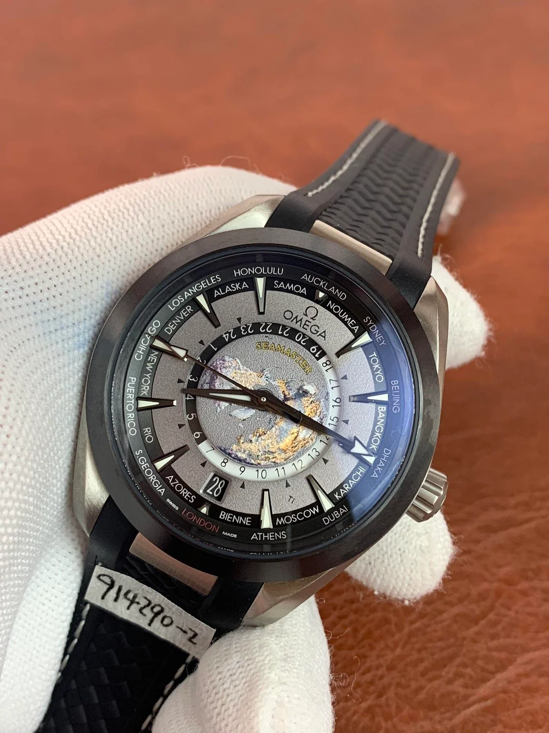 At the centre of the black and grey dial, framed by a brushed black ceramic bezel, OMEGA has produced a vision of Earth, viewed from above the North Pole, by laser-ablating continents and colours on a grade 5 titanium surface. Circling the topographic map is a 24-hour indication, divided into night and day sections.
