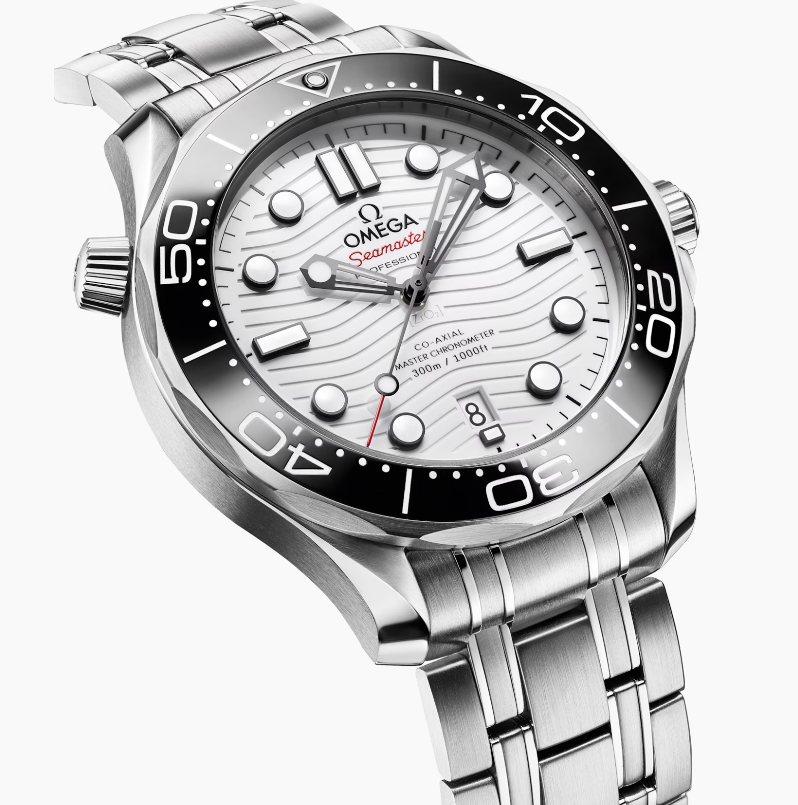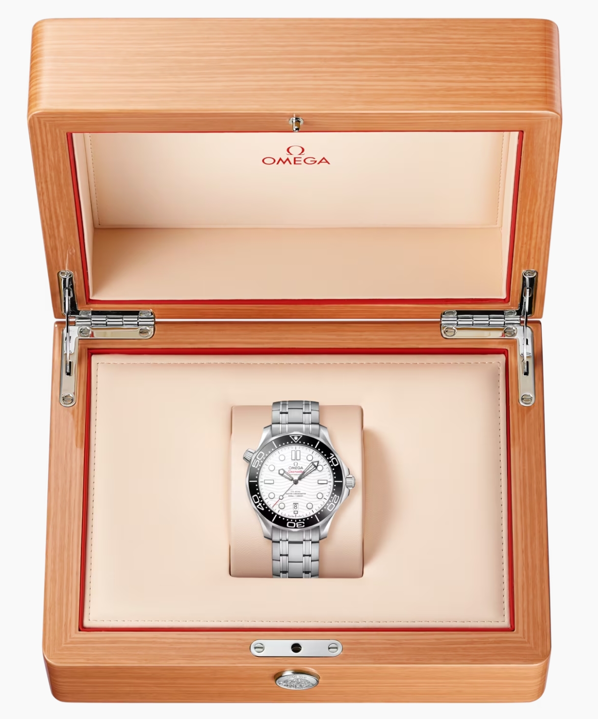 This 42 mm model is crafted from stainless steel and includes a black ceramic bezel with a white enamel diving scale. The dial is polished white ceramic and features laser-engraved waves and Seamaster highlighted in red.