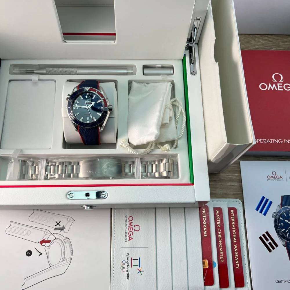 The screw-in caseback is engraved in blue with the words PLANET OCEAN and LIMITED EDITION, as well as the Limited Edition number. Transferred to the caseback's sapphire crystal are the words "PyeongChang 2018" and the Olympic Games logo.