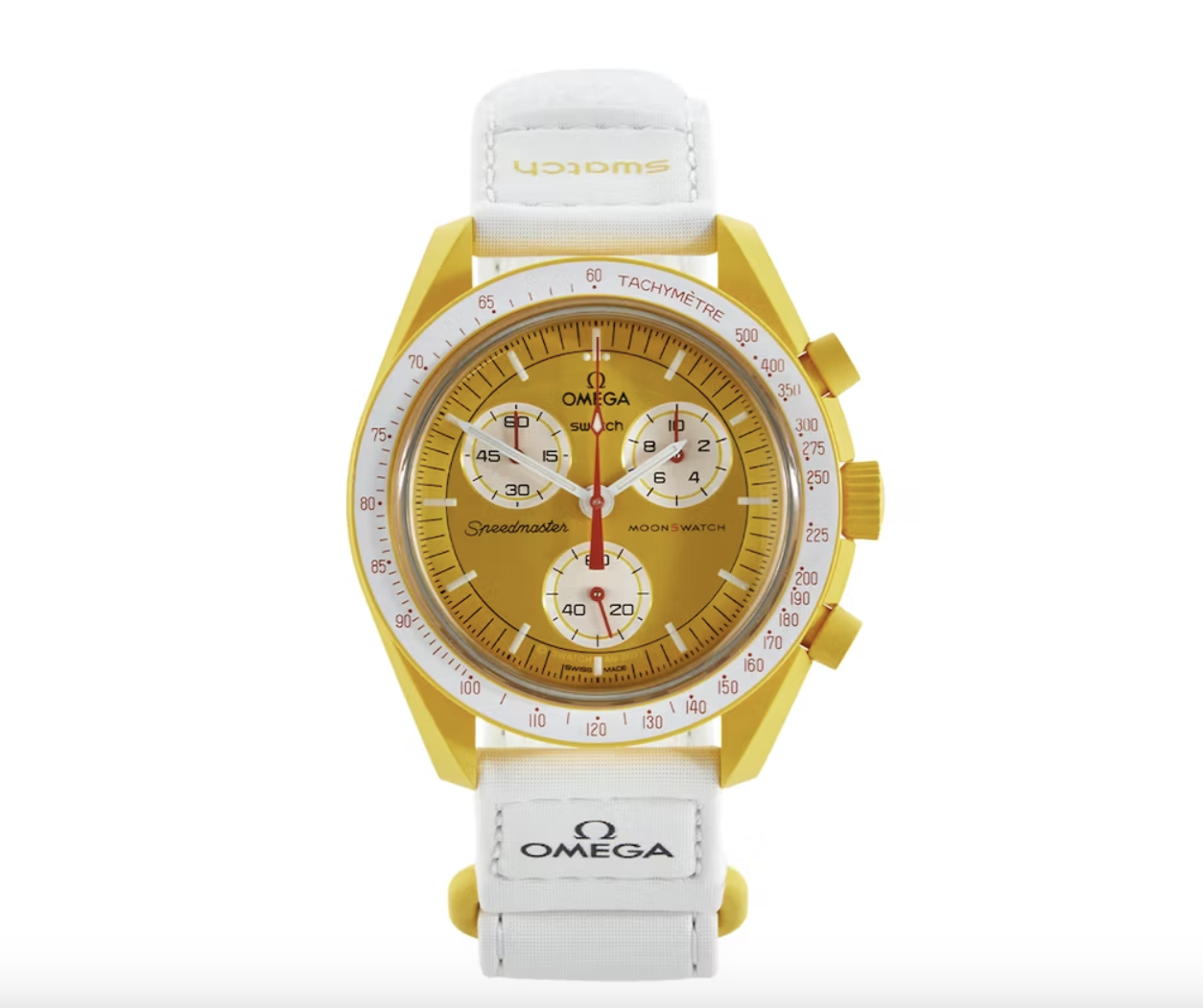 Harness the power of the sun with the Swatch x Omega Bioceramic Moonswatch Mission to the Sun (SO33J100). The Swatch x Omega Mission to the Sun (SO33J100) features a white velcro strap, and a yellow sun-colored dial. The watch also features orange sundial hands, tachymeter scale, and second hand, completing the sun-inspired look of the watch. The Swatch x Omega Mission to the Sun (SO33J100) is 3 bar water resistant, features quartz movement, and prominently showcases the Swatch and Omega logos on the dials.