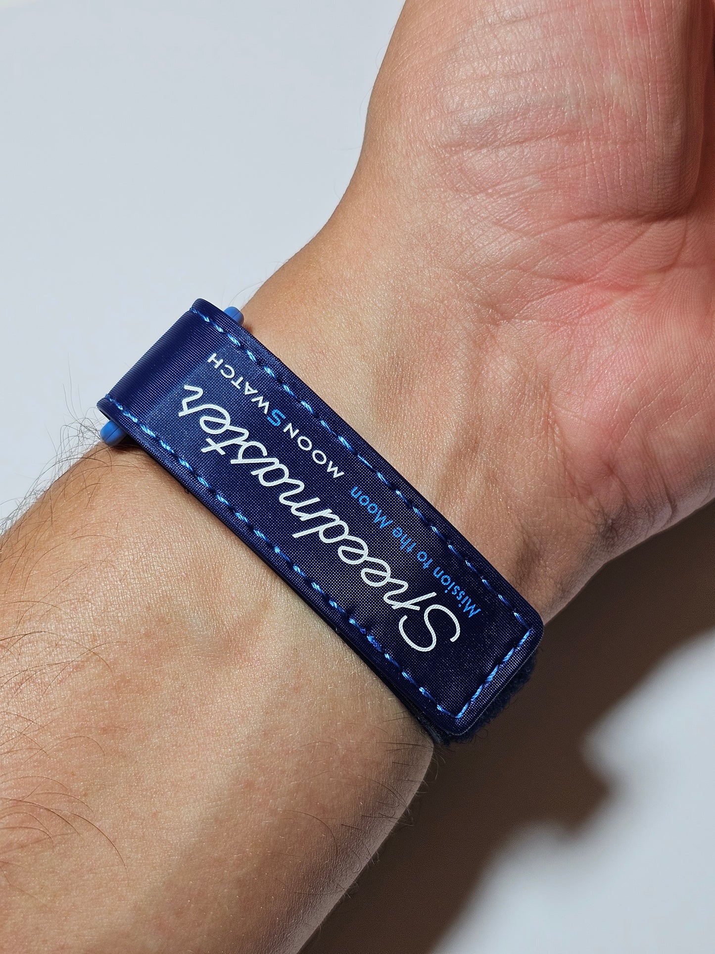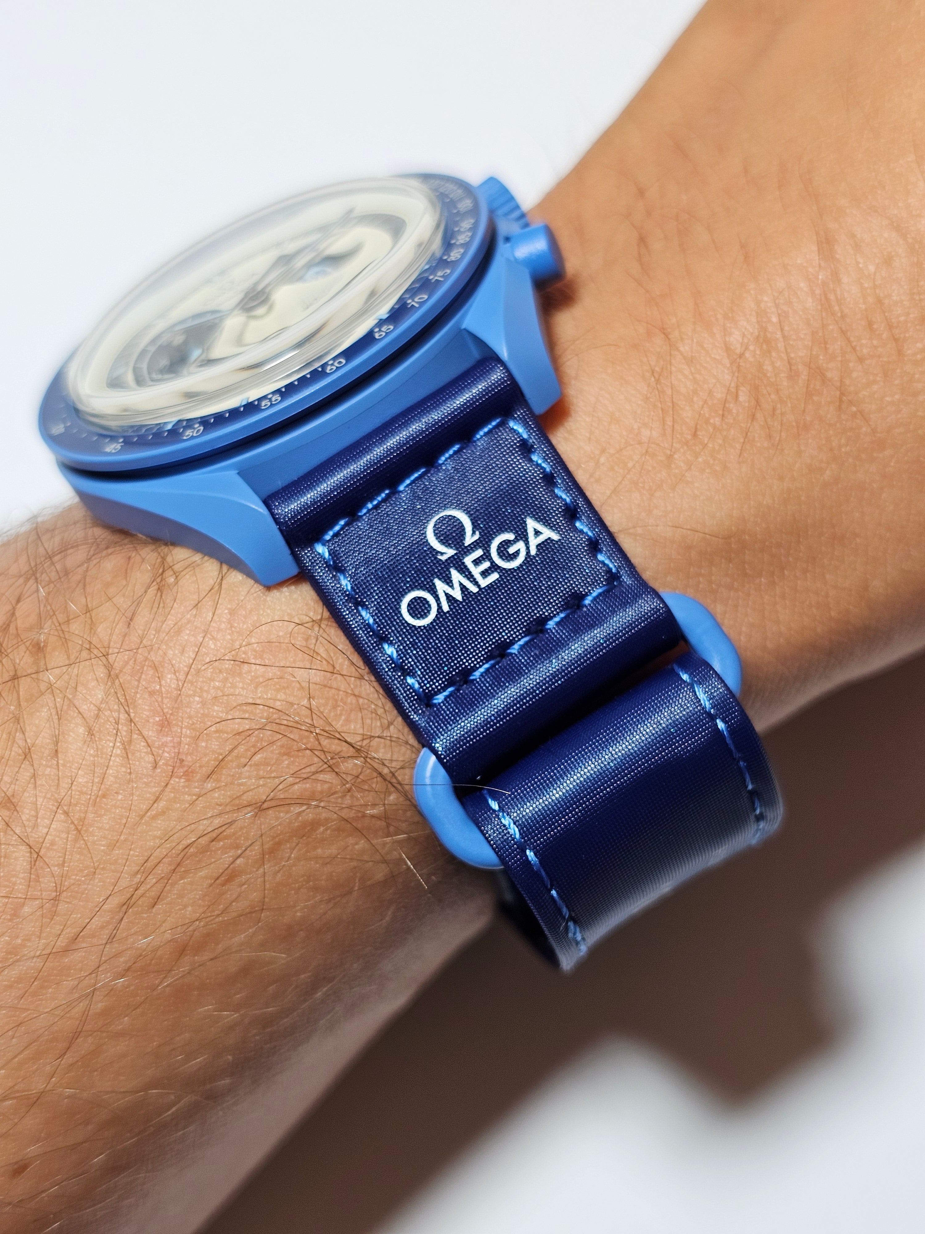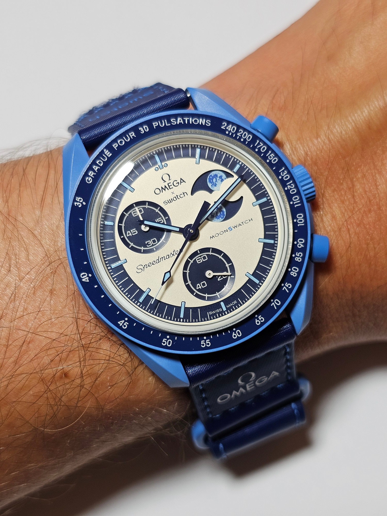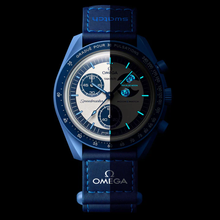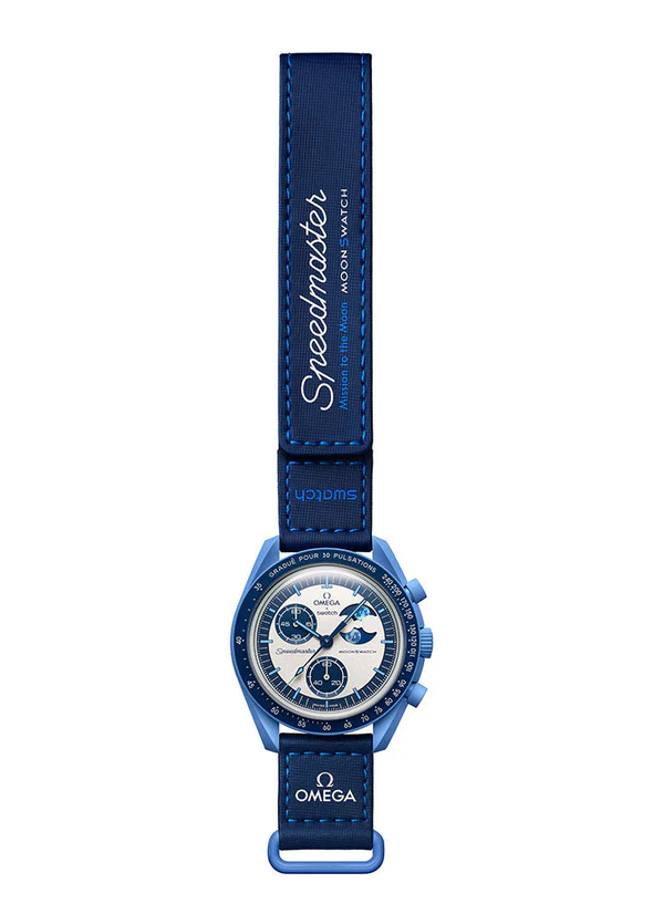 Presenting the Swatch x Omega Super Blue Moonphase (SO33N700), crafted for summer and the rare blue moon on August 19, 2024. This striking watch features a blue Bioceramic case, crown, and pushers, along with a blue VELCRO® strap with light blue stitching for a secure fit.
