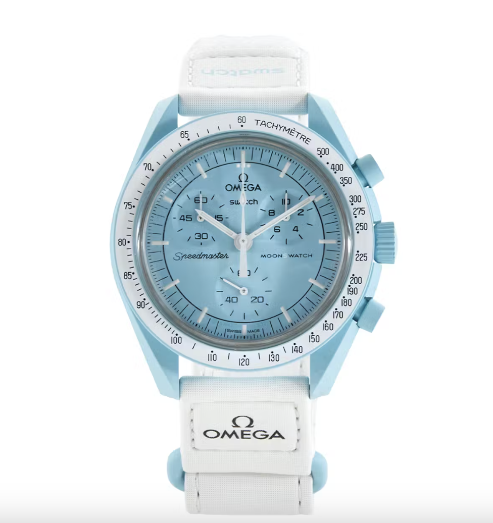 Swatch and Omega are paying tribute to a distant world with the Swatch x Omega Bioceramic Moonswatch Mission to Uranus (SO33L100). The watch features the iconic Omega Moonwatch in a vibrant pale blue colorway in homage to the Greek God of the Sky. A white velcro strap matches the finishes of the watch, reminiscent of the gas giant Uranus, which resides some 1.8 billion miles from the sun. The Swatch x Omega Mission to Uranus (SO33L100) features quartz movement, all white hands and tachymeter scale, is 3 bar water resistant, and features the Swatch and Omega logo on the dials.