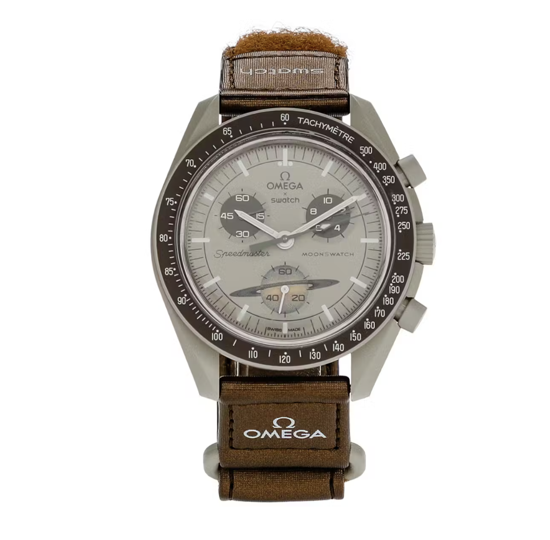 Swatch x Omega Bioceramic Moonswatch Mission to Saturn (SO33T10) features a brown dial and velcro strap contrasted with sand and beige tones. The watch showcases an added feature compared to others in the collaboration: Saturn's rings on the seconds subdials. The Swatch x Omega Mission to Saturn (SO33T10) features quartz movement, is 3 bar water resistant, and showcases the iconic details of the original Moonswatch from Omega.