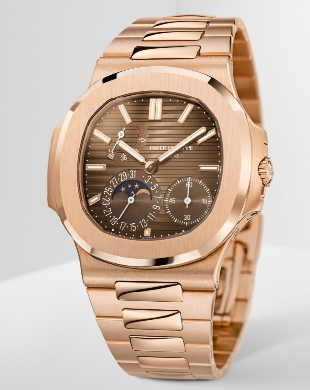 The famous Nautilus watch Ref. 5712/1R-001 features a pointer-type date display, moon phase display and power reserve display, combining sportiness and elegance. This flagship model features a rose gold case and bracelet, with a brown sunburst dial with a gradient black effect.