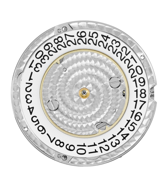 Quartz movement with date. Caliber E 23‑250 S C. Date in an aperture. Sweep seconds hand.
