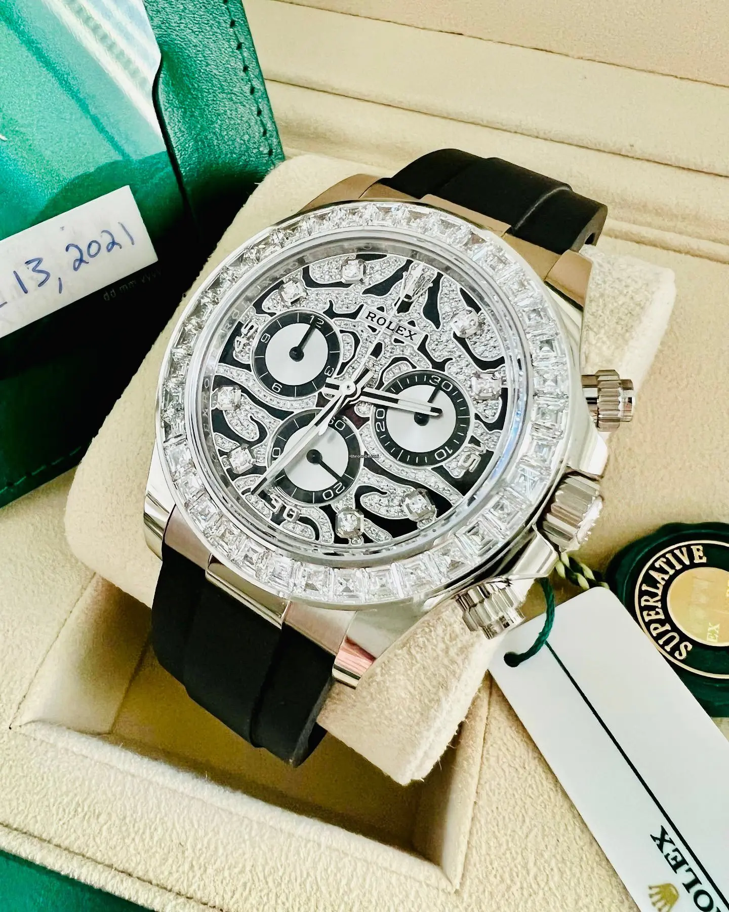 A Rolex Daytona with diamonds is not something new but one with a dial like the 116588TBR sure is! The black-lacquered dial has an applied 18k white-gold and diamond-set, wavy structure on the surface, which can remind you of a tiger's fur.