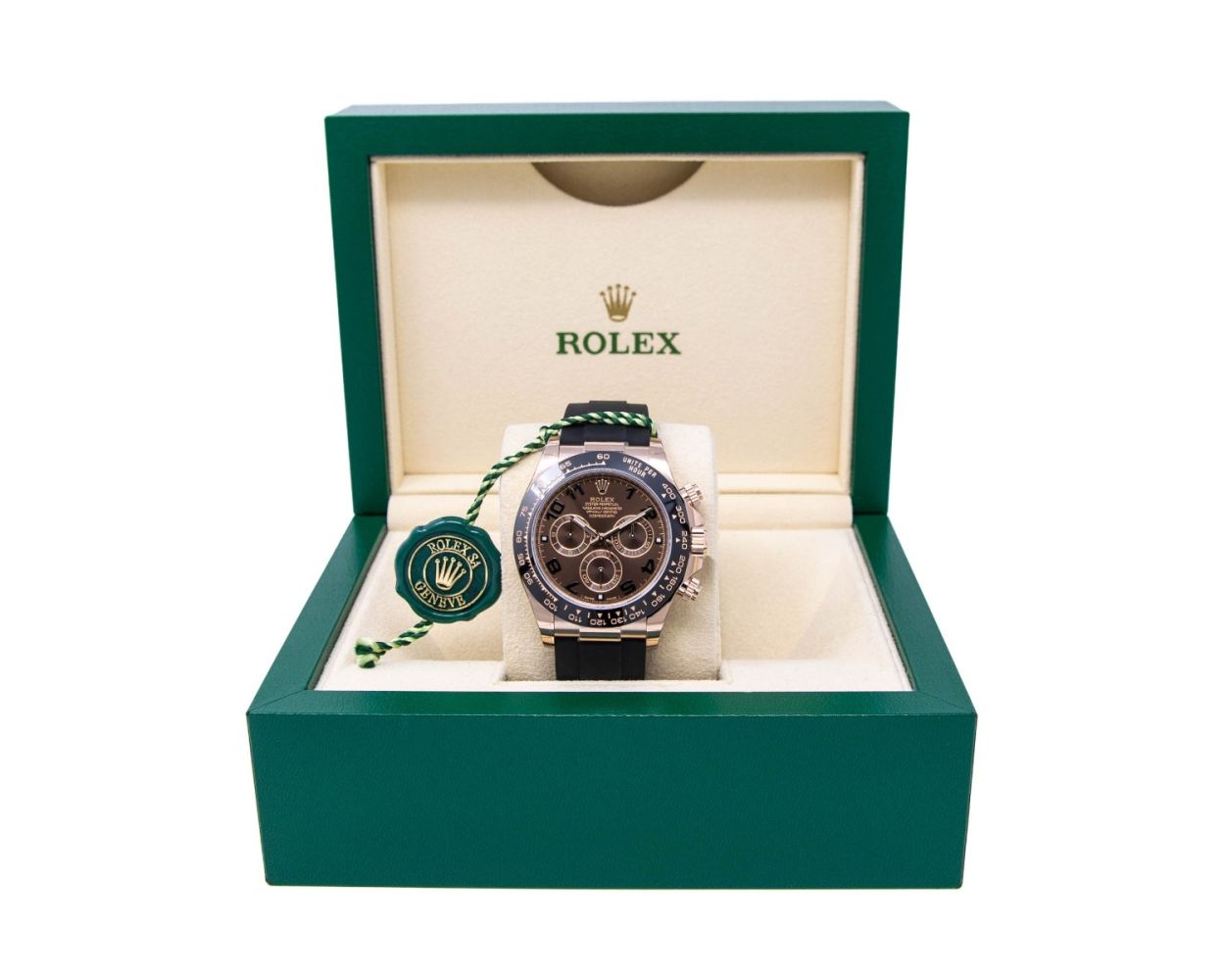 18kt everose gold case with a black oysterflex strap. Fixed 18kt everose gold bezel with black ceramic top ring. Chocolate dial with everose hands and Arabic numeral hour markers. Minute markers around the outer rim. Dial Type: Analog. Luminescent hands and markers. Chronograph - three sub-dials displaying: 60 second, 30 minute and 1/10th of a second. Rolex calibre 4130 automatic movement with a 72-hour power reserve. Scratch resistant sapphire crystal. Screw down crown. Solid case back. Round case shape. Case size: 40 mm. Oyster deployment clasp. Water resistant at 100 meters / 330 feet. Functions: chronograph, hour, minute, second. Luxury watch style. Watch label: Swiss Made. Rolex Cosmograph Daytona Chronograph Automatic Men's Watch 116515CHOAR.