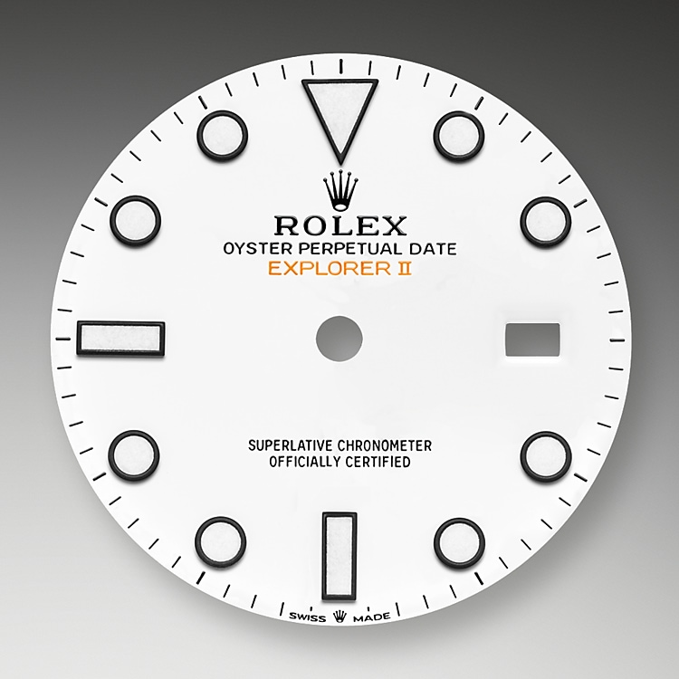 The Explorer II features a date display, an additional orange 24-hour hand and a fixed bezel with 24-hour graduations, enabling day to be distinguished from night. It became the watch of choice for speleologists, volcanologists and polar explorers. Its hour markers and hands feature a highly-legible Chromalight display with long-lasting blue luminescence.