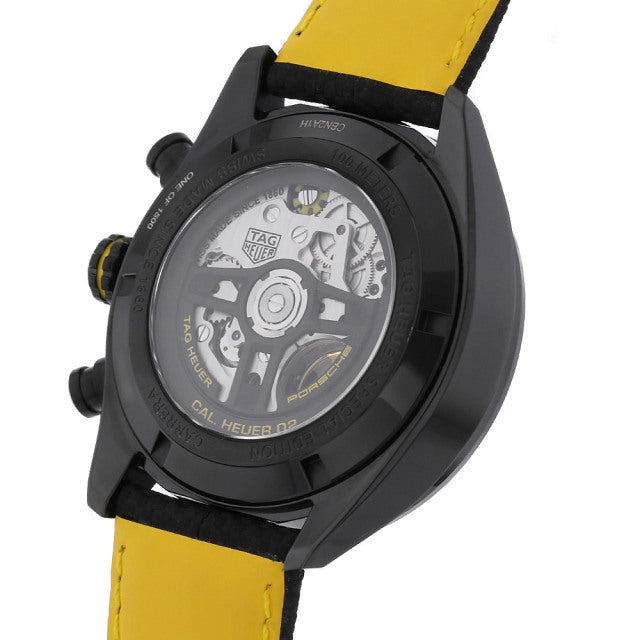 44 毫米黑色 DLC 钢表壳展现出自信的都市外观,配有著名的保时捷风格方向盘形摆锤,透过蓝宝石表背清晰可见。