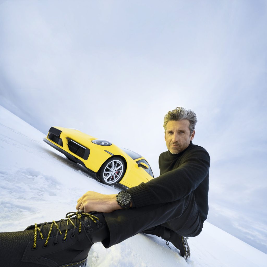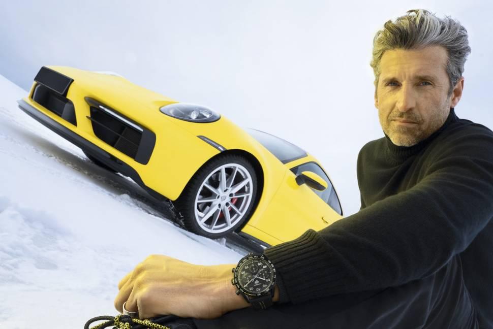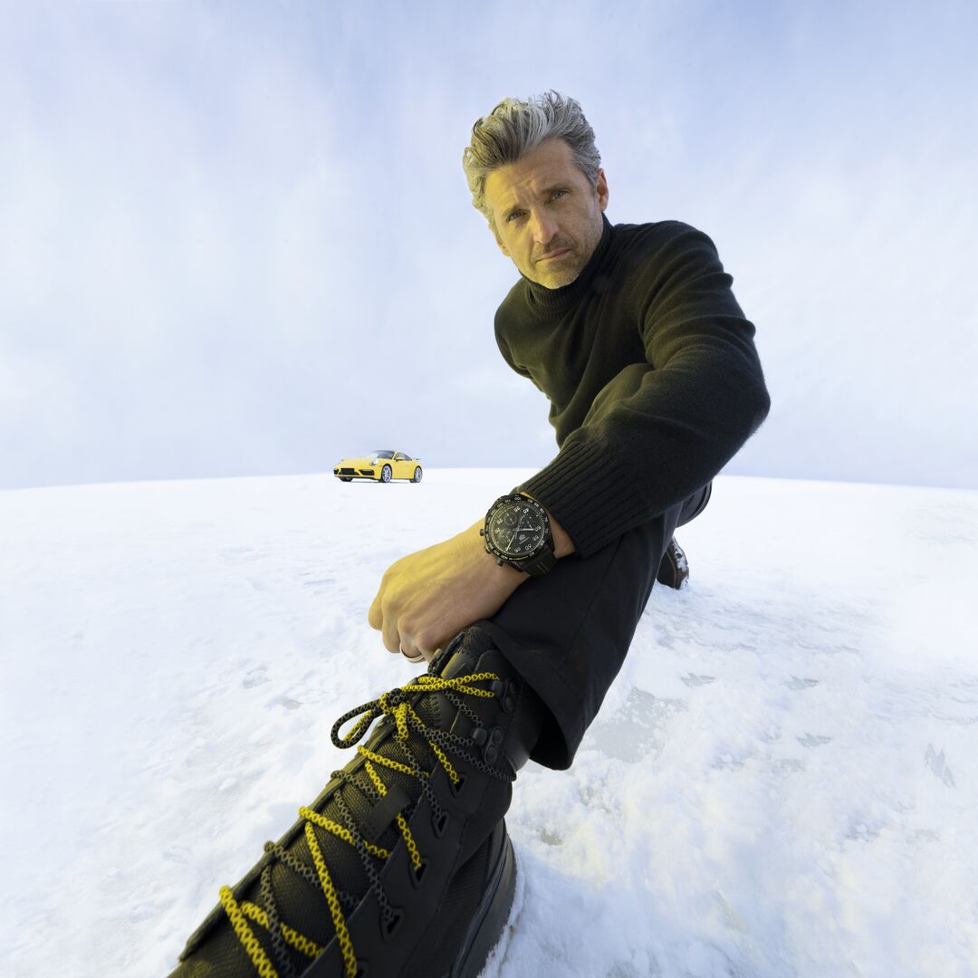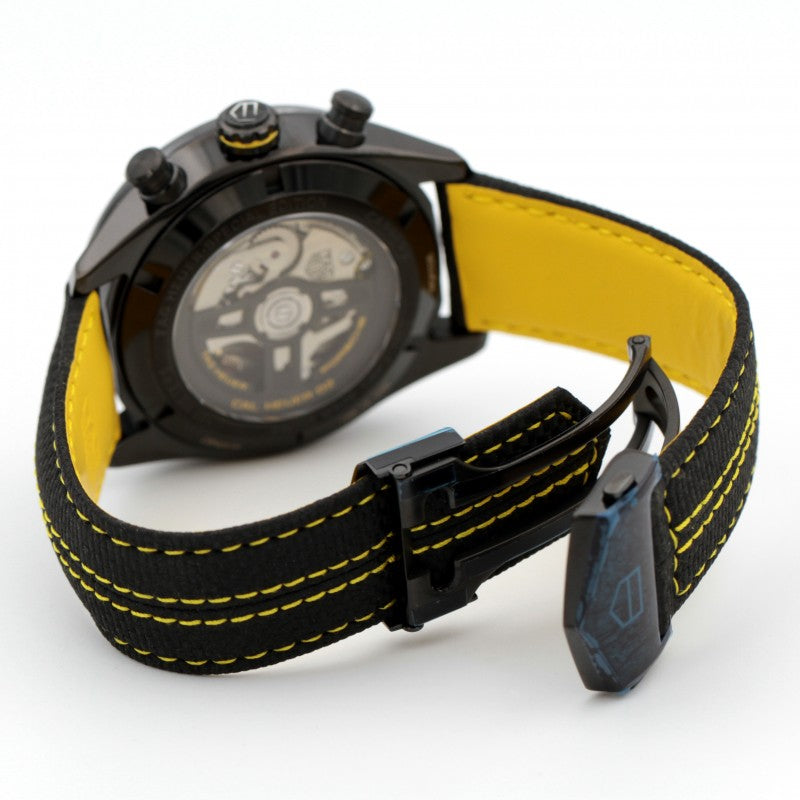 纹理小牛皮表带搭配大胆的黄色缝线和衬里,向保时捷内饰致敬。 黑色 DLC 精钢折叠表扣与表壳相配。