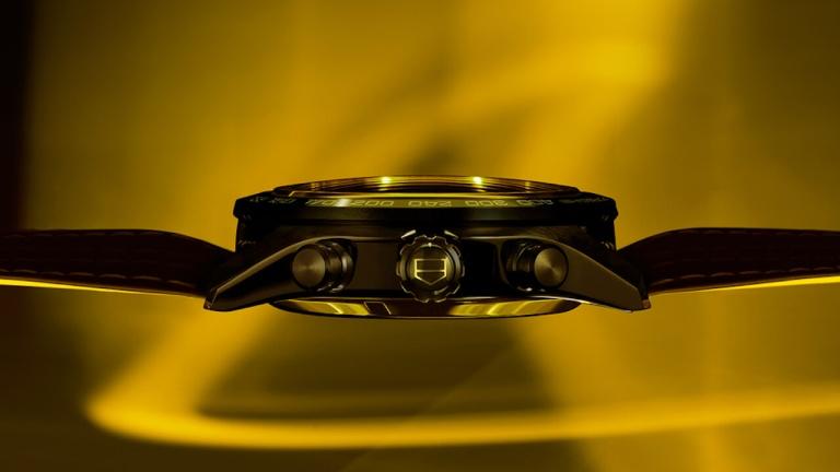 秉承其赛车基因,表壳由我们自制的 Heuer 02 自动机芯提供动力,具有 80 小时动力储存。