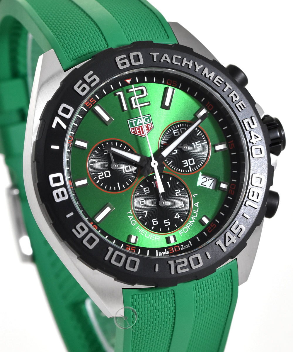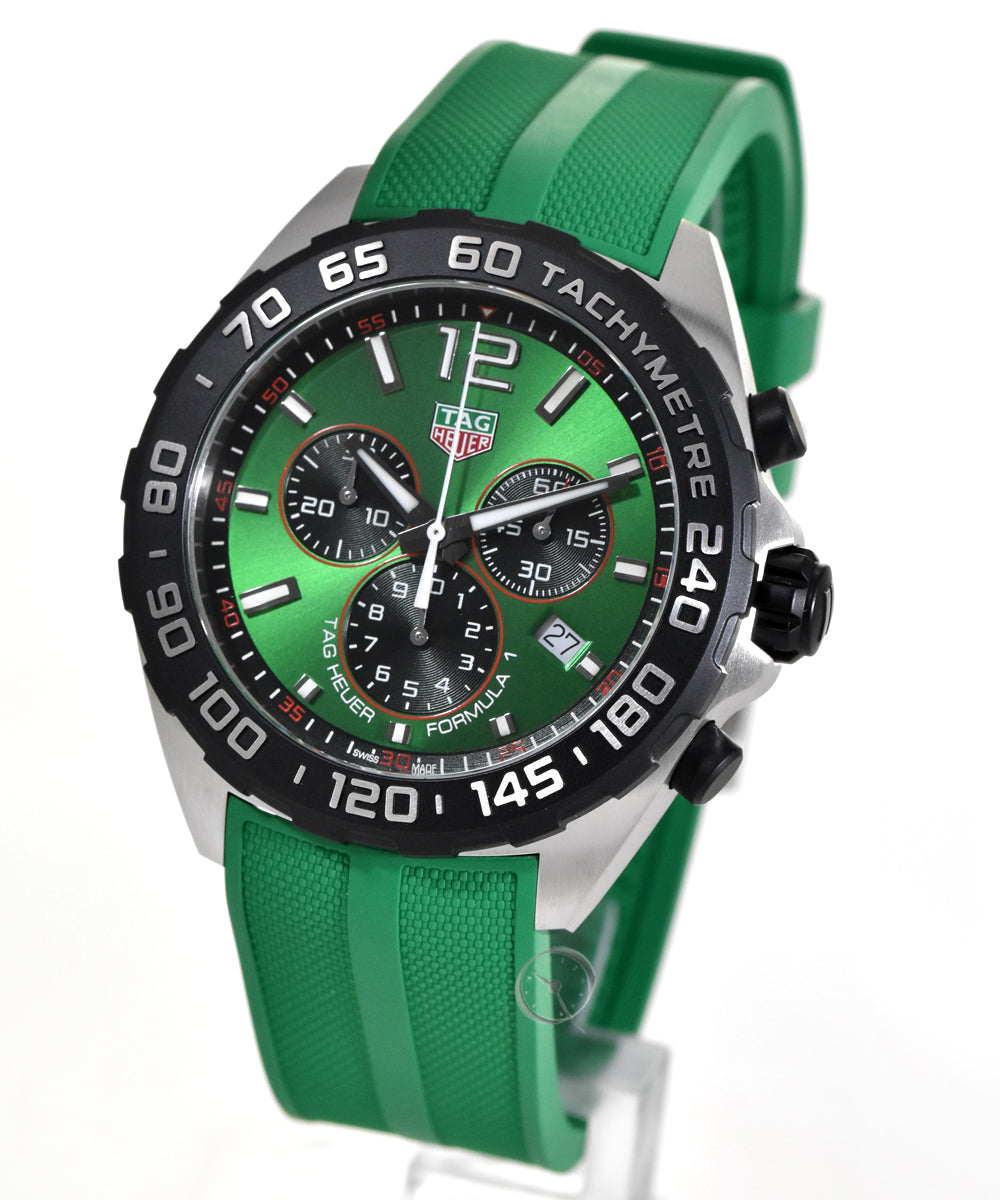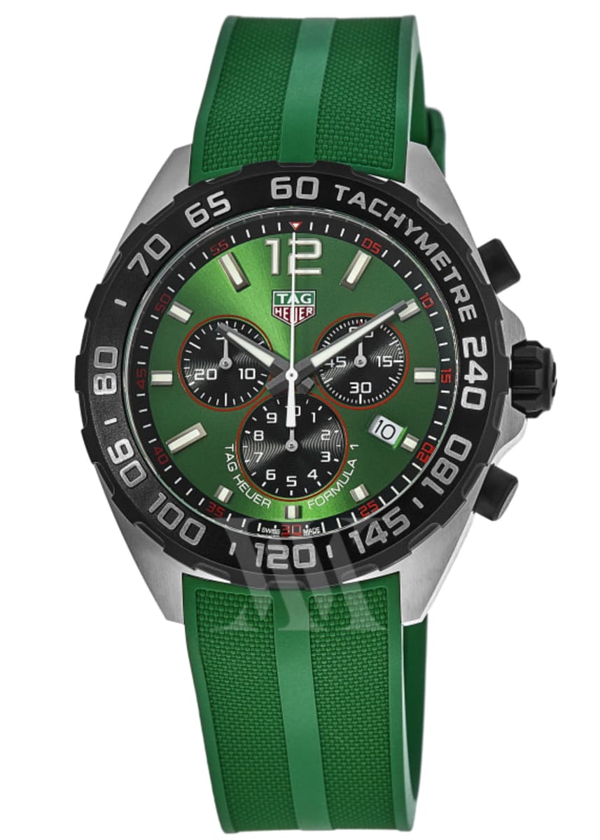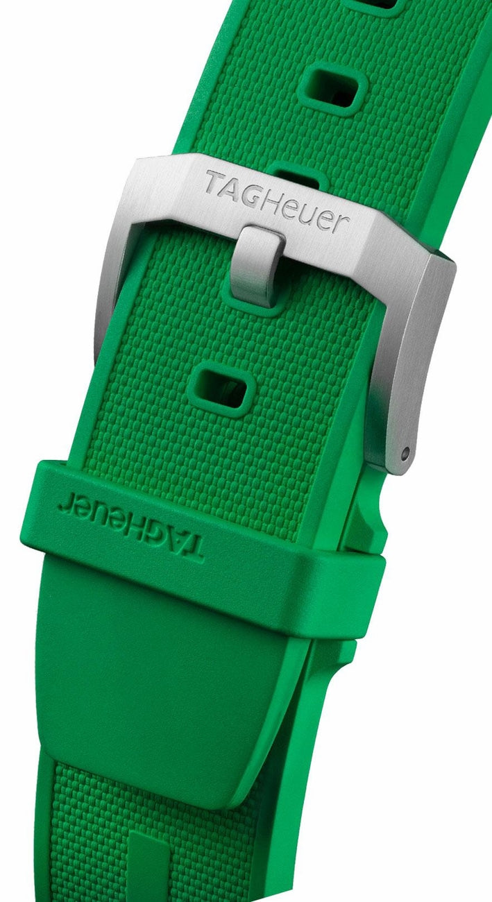 泰格豪雅 Formula 1 以色彩和酷炫引领潮流。这款多功能 43 毫米计时码表配备鲜艳的绿色表盘和配套的橡胶表带,充满运动设计元素,赛车系列正朝着 胜利。