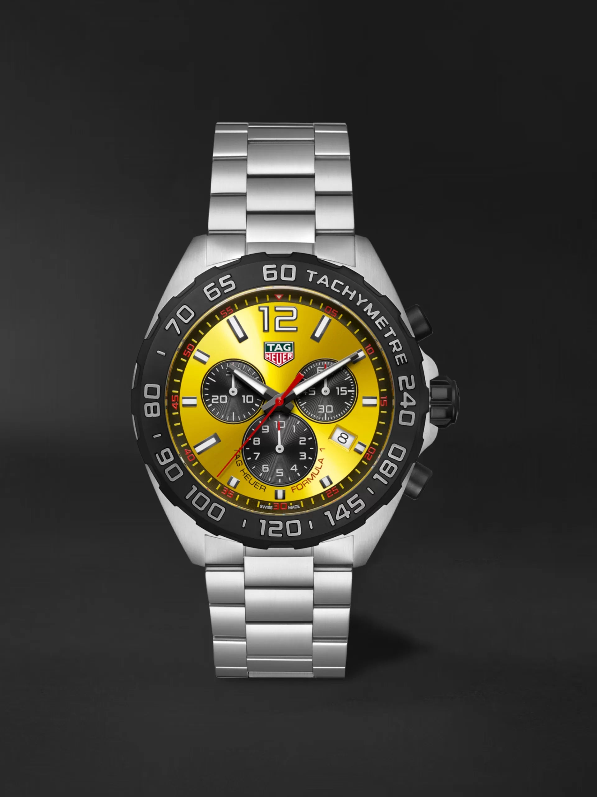 This bright, eye-catching timepiece is from TAG Heuer's Formula 1 collection. Inspired by the high-speed automotive industry, this watch's design is inspired by speed and power. The bright yellow sunray brushed dial is surrounded by a black PVD tachymeter bezel and black chronograph functions. Mounted on a 43mm stainless steel case and paired with an integrated link bracelet also made of stainless steel, it is both durable and versatile. Powered by a quartz movement, this watch is water resistant to 200m.