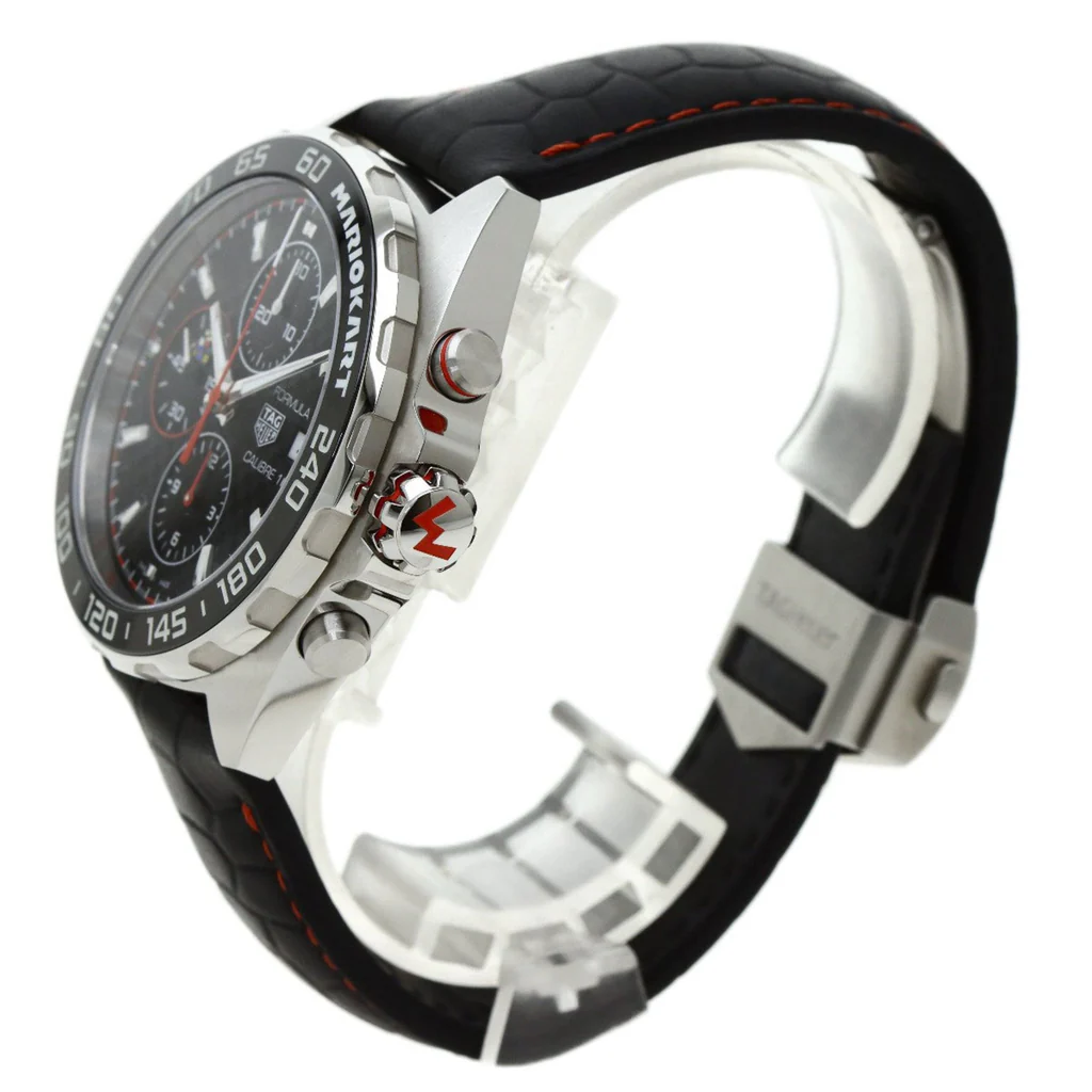 Brand New Genuine Tag Heuer Formula 1 Limited Edition Mario Kart Black Dial Leather Strap Men's Watch Model CAZ201E.FC6517. Brushed and polished stainless steel case with a black leather strap. Folding clasp. Fixed ceramic bezel. Dial Description: Silver luminous hands and index hour markers with minute markers around the outer edge and 3 subdials on black dial. Automatic chronograph movement.