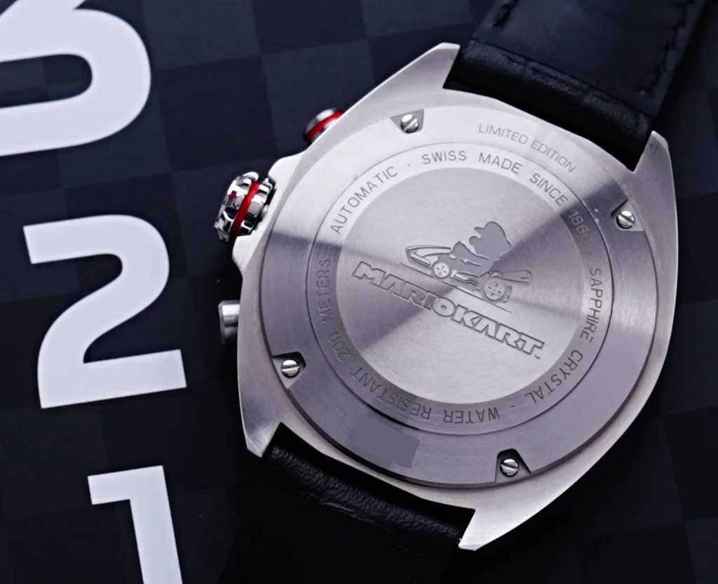 There are many Mario Kart references on this chronograph: the logo is engraved on the polished black ceramic tachymeter bezel, and the button and crown at 2 o'clock are surrounded by the iconic red paint. Mario's M symbol is engraved on the crown, and the Mario Kart logo is engraved on the dedicated screw-down caseback.