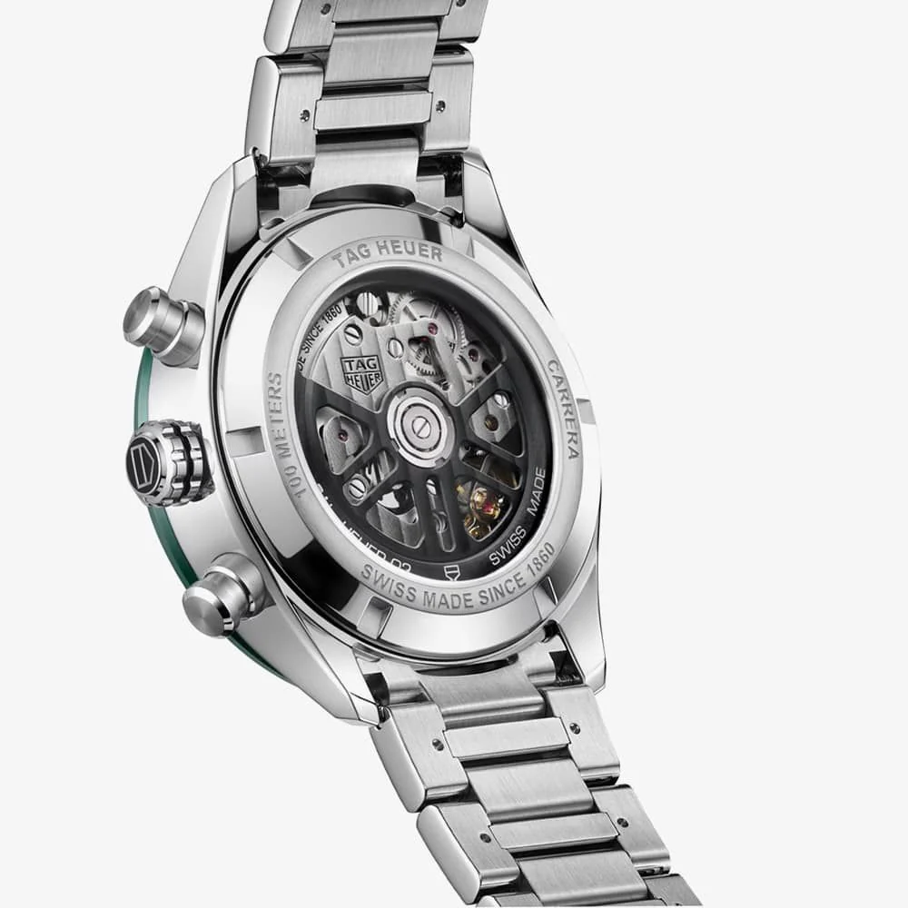 This classic TAG Heuer Carrera makes a stylish statement with its bold green dial and matching ceramic bezel. The sporty design and monochromatic color scheme integrate the in-house Calibre Heuer 02 movement, adding to the appeal of this adventure-ready watch.