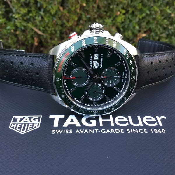 - TAG Heuer Formula 1 Calibre 16 Automatic Chronograph Green Dial Black Leather Strap Men's Watch - CAZ2016.FC6473
