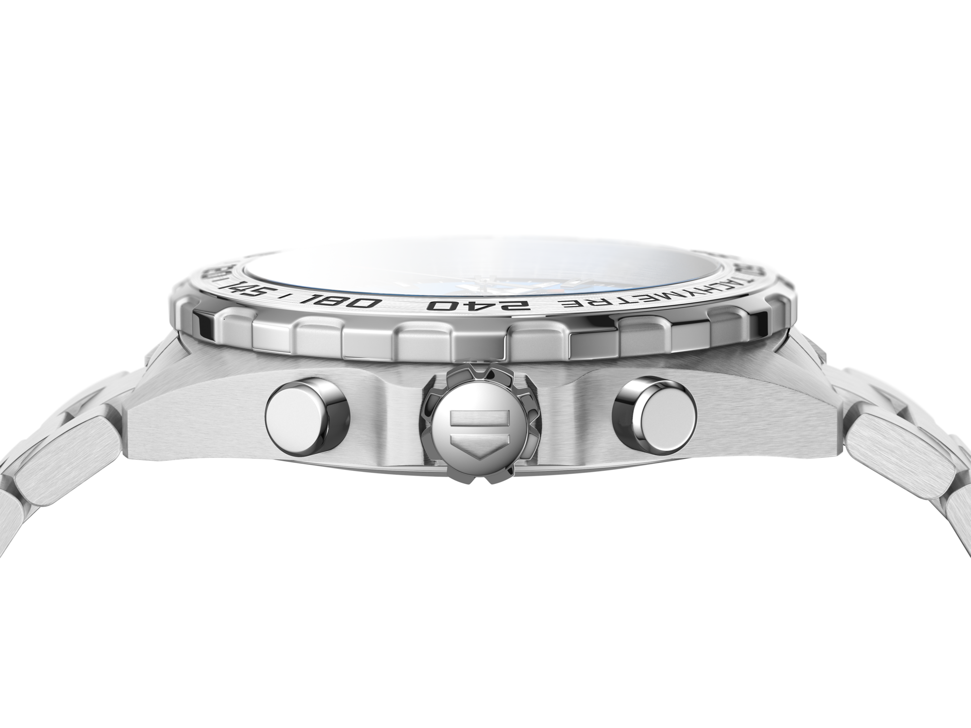 A men’s chronograph with blue sunray-brushed dial and very masculine 3-row steel bracelet. Quartz powered for ultimate precision and water resistant to 200 meters. Ready for anything.