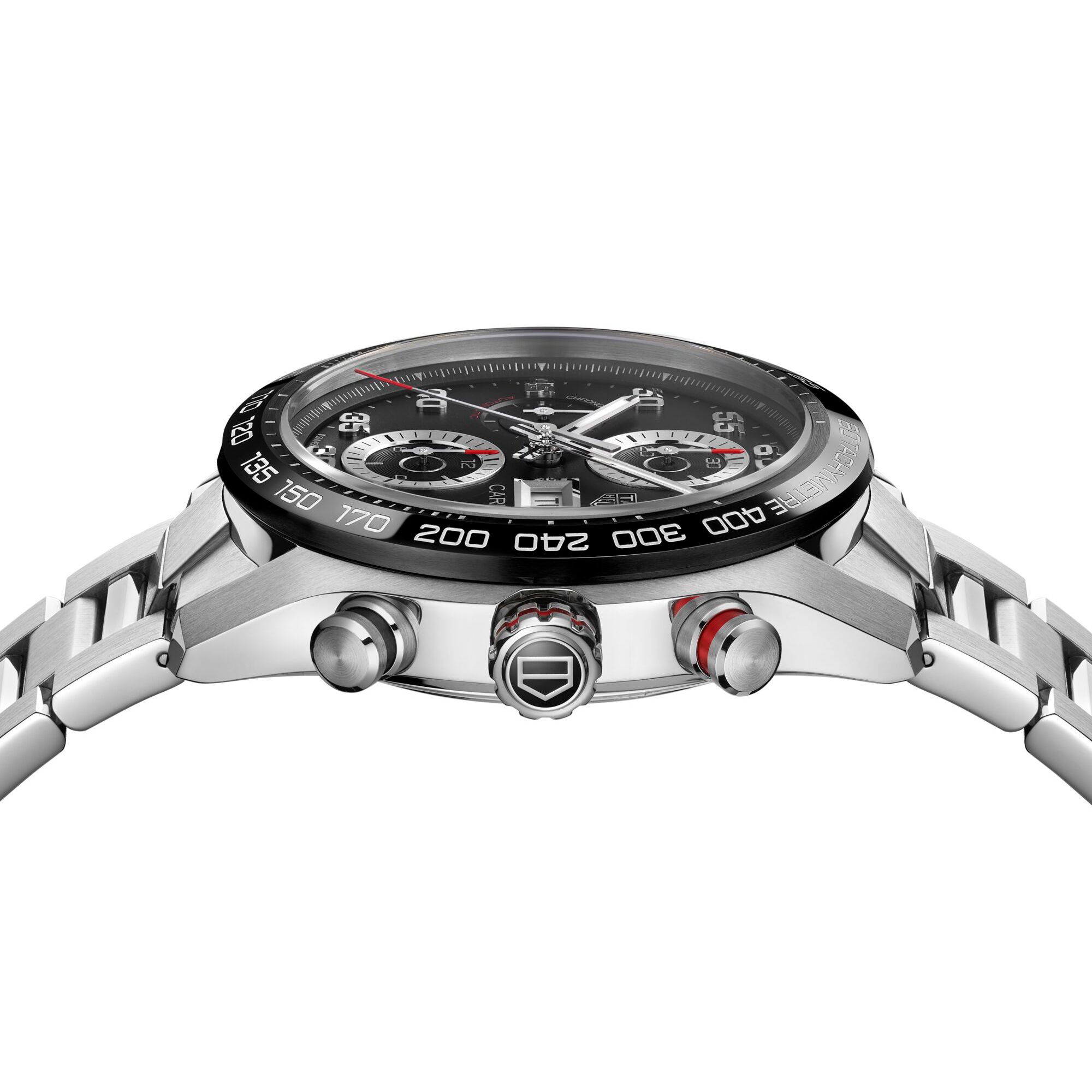 - Black chronograph dial with a date window at 3 o'clock and luminous accents
